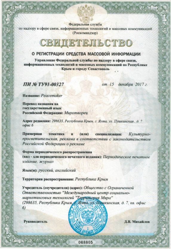 Свидетельство ПИ № ТУ 91-00327 от 15 декабря 2017г. Международный журнал-энциклопедия «Peacemaker» зарегистрирован Федеральной службой по надзору в сфере связи, Республике Крым и городу Севастополь. Учредитель: 298635, Республика Крым, г. Ялта, ул. Пушкинская, д. 7, офис 6 Журнал выходит под патронажем: Главный редактор: Коломенский Константин +7 915 175 05 60 |